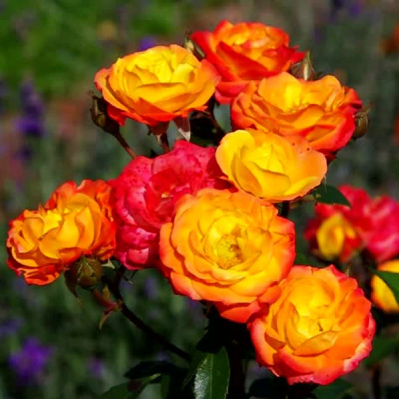 Куст компактный и густой, достигающий в высоту 40-60 см и в ширину 50 см. На крепких побегах формируются среднего размера, насыщенного зеленого цвета листики с глянцевой поверхностью. Облиственность у растения довольно сильная. Однако несмотря на это, в период активного цветения кусты почти полностью покрыты соцветиями, за счет чего практически не видно листву. Желто-оранжевые с малиновыми полосами бутоны имеют овальную, заостренную форму. По мере распускания цветка окрас лепестков становится более желтым с красно-оранжевыми краями. Форма цветка – от чашевидной до розетковидной. Оттенки плавно переходят один в другой. Цветки махровые, диаметром 4-6 см, в каждом от 25 до 45 лепестков. На одном стебле образуется 5-10 цветков, собранных в соцветия, покрывающие весь куст. Сорт обладает слабым ароматом, но очень приятным, с легкими пряными нотками чайного дерева и масла иланг-иланга. Посадка саженцев полиантовых роз соответствует правилам высаживания обычных. С той лишь разницей, что они не такие требовательные к месту посадки и прекрасно растут в полутени. Это даже лучше, чем солнцепек. Им не страшна избыточная влажность, но это не значит, что их надо специально высаживать в подтапливаемых местах, с высоким залеганием грунтовых вод.